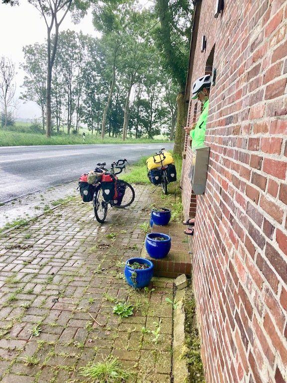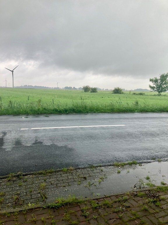 Wir machen uns dann auf den Weg in Richtung Jever - Jadebusen. Dazu haben wir einen Weg über Land gewählt. Es geht auf ruhigen und wenig befahrenen Straßen gut voran. Nach gut einer Stunde dann wieder der erste Regenschauer. Eine Unterstellmöglichkeit finden wir an einem einsam in der Landschaft stehenden Bauernhaus.