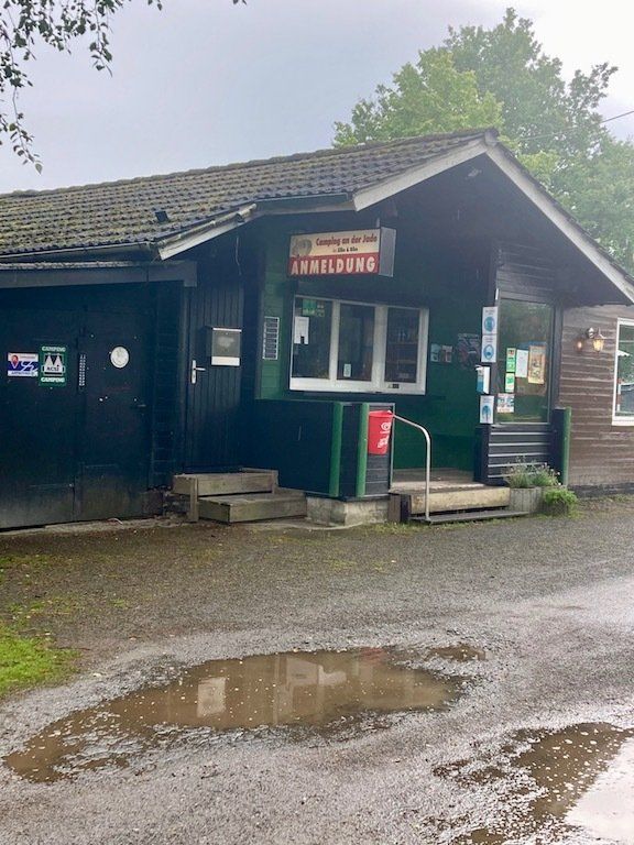Der Wind hat auch wieder zugenommen, wie schon zuvor bläst er uns immer ins Gesicht. Gegen 15.30 Uhr treffen wir am Campingplatz Stolzenau ein. Der liegt direkt an der Weser. Die Rezeption ist erst ab 16 Uhr besetzt. Nach dem Eichecken können wir uns einen Platz direkt in der ersten Reihe aussuchen. Im Moment sind wir die einzigen Zeltcamper.