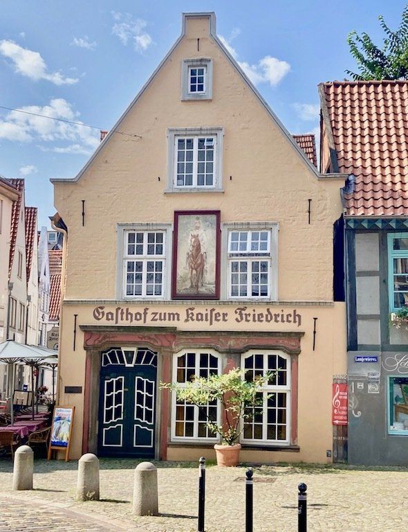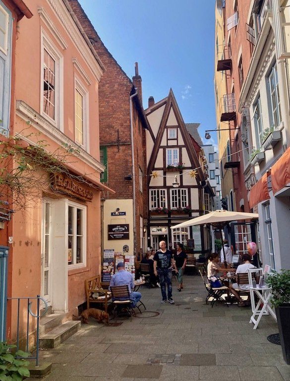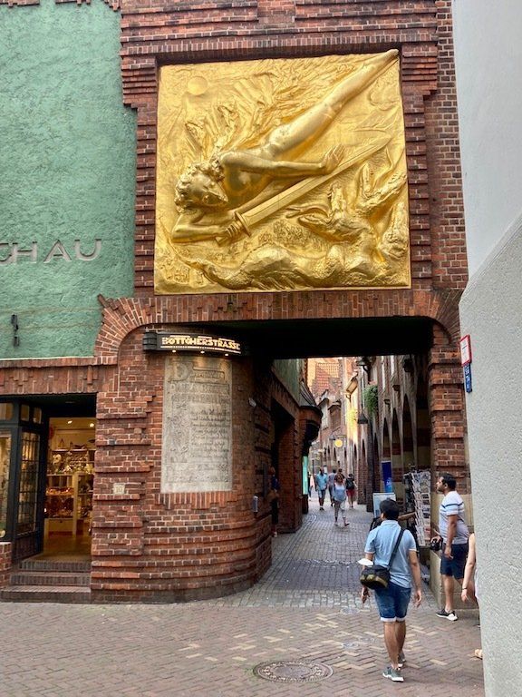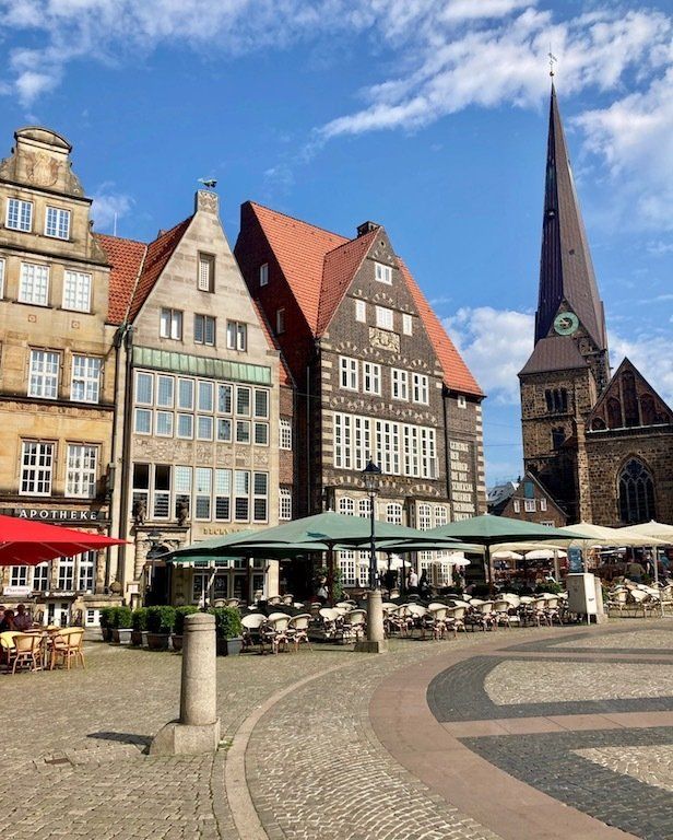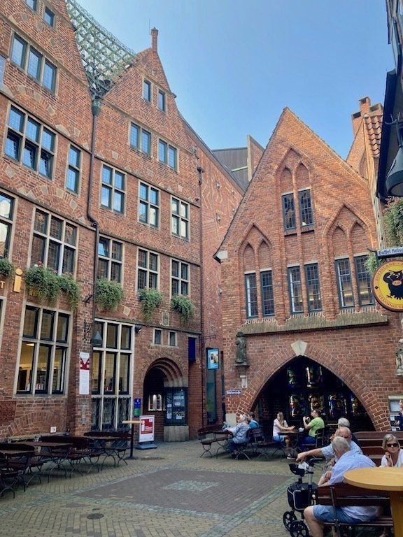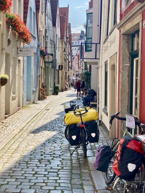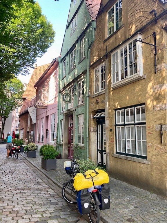 Um 9.45 Uhr geht's mit repariertem Rad weiter. Zunächst radeln wir in die Bremer Innenstadt. Da Jochen ja gebürtig aus Bremen ist, gibt es für mich eine kleine Stadtbesichtigung mit einem ortskundigen Stadtführer. Rathausplatz, Böttchergasse und Schnoorviertel stehen auf dem Besichtigungsprogramm.