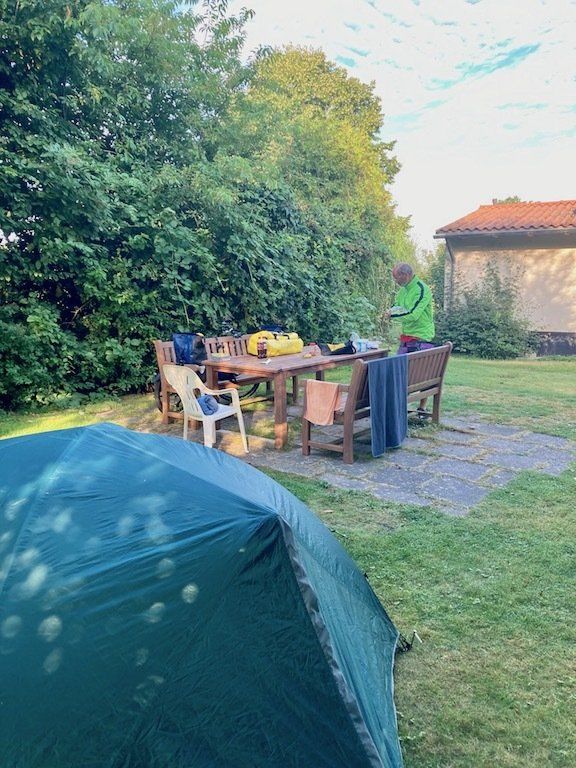 Gut geschlafen und trocken ist es auch, bis auf ein bisschen Morgentau. Frühstück gibt es auf dem Campingplatz, Bank und Tisch sind ja vorhanden. Aufbruch ist um 8.45 Uhr.