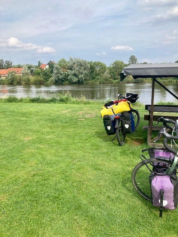 Doch schon beim Aufbauen unserer Zelte treffen weitere Radreisende ein. Mal schauen, wie voll es heute Abend ist. Bereits während unserer Fahrt ist uns aufgefallen, dass der Weserradweg im Moment stark mit Radreisenden befahren ist. Der größte Teil fährt aber mittlerweile mit Pedelecs.