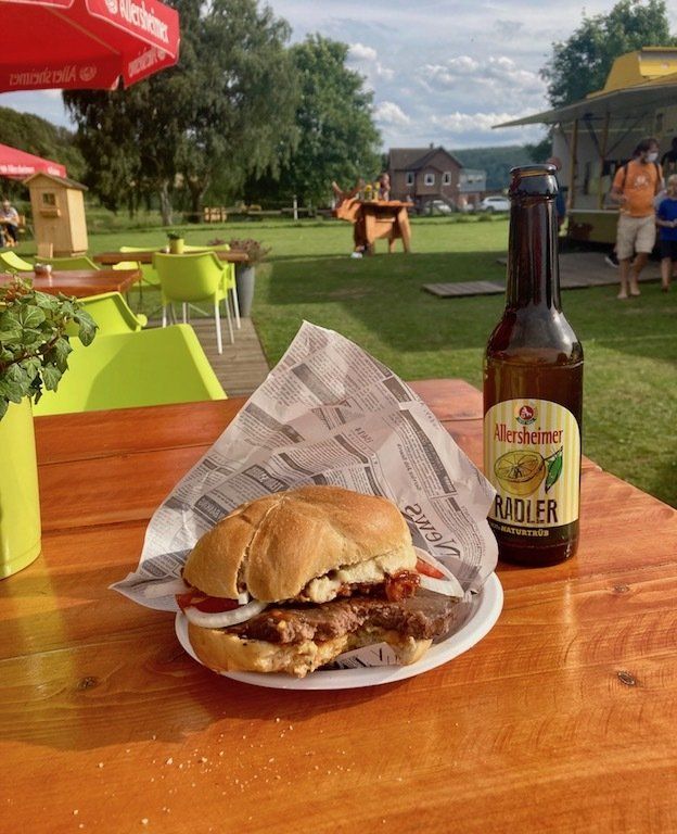 Zum Abendessen geht's nebenan auf die Wiese. Hier steht ein Verkaufswagen unser Campingplatzvermieter. Tische und Stühle sind vorhanden, das Speisenangebot ist vielfältig. Wir entschließen uns an dem Abend mal für einen Burger und dazu gibt es ein Radler. Lecker ! Das Wetter ist richtig gut und es ist warm. Wir verbringen den Abend hier auf der Wiese, bevor es bei Einbruch der Dunkelheit wieder ins Zelt geht. Morgen soll das Wetter umschlagen !!!